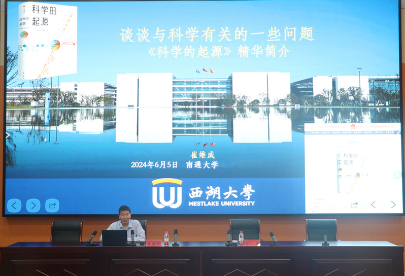 崔维成以《谈谈与科学有关的一些问题——<科学的起源>精华简介》为题,介绍了《科学的起源》创作的背景和意义,并从科学技术及科学思想两个维度,探究科学家和核心科学理论如何一步步推动科学体系形成及发展,以展现东方科学在科学史上的重要地位。《科学的起源》一书系统介绍了科学的定义、科学的起源及科技发展的历程,并通过时间推演及不同地域、领域间的比较,得出科学理论间相互联系的论断。崔维成在分享著书体会时,指出要用整体的、系统的眼光审视科学技术发展的过程,并深入探讨如何运用科学思维驱动创新发展。他指出,科学研究是一条永无止境的道路,科学家精神就是实事求是的精神,高校要用系统的思维来培养人才。他勉励师生要始终保持对知识的探索和对问题的思考,以科学的态度和精神,不断前行在追求真理的道路上。