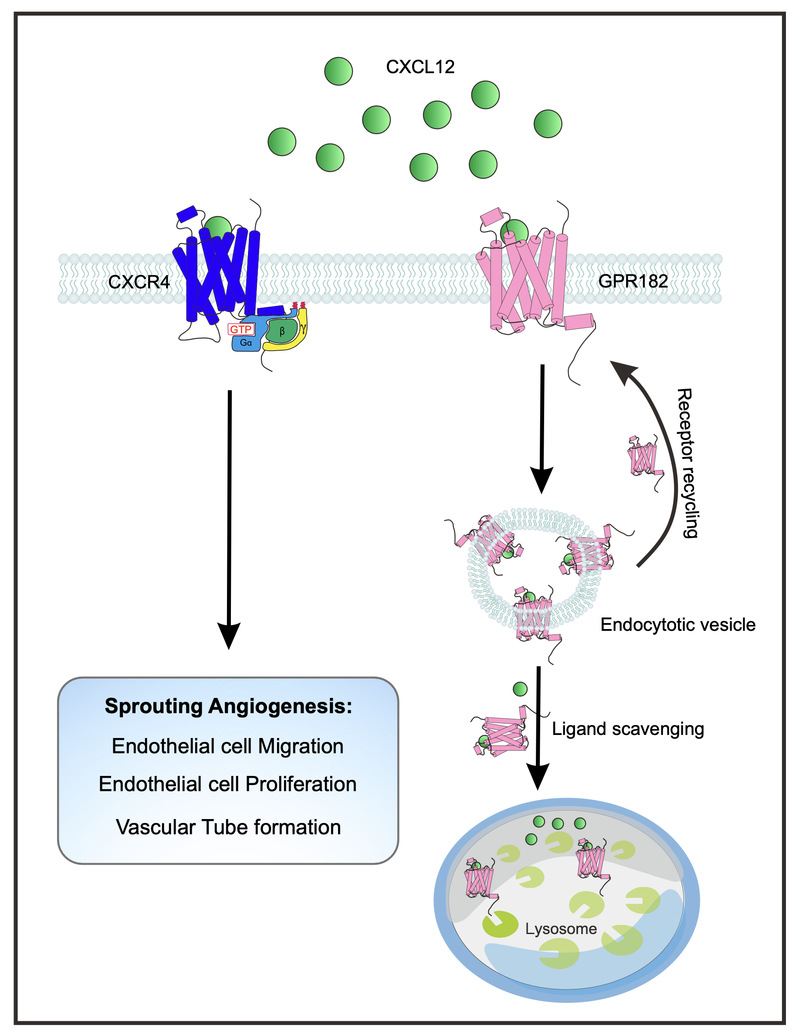 血管新生是指从已有血管形成新血管的生理过程,其在胚胎发育以及肿瘤进展等过程中均发挥着重要作用。以肝癌为代表的高血管化肿瘤,往往展现出强烈的血管新生活性。肿瘤内部密集且紊乱的血管网络会阻碍化疗和放疗等治疗手段的疗效,原因在于药物可能无法充分渗透至肿瘤内部。寻找新的血管新生调控因子用于治疗高血管化肿瘤有很高的必要性。该研究团队通过分析肝癌病人组织样本特点,结合单细胞和转录组测序手段发现,肝癌组织中GPR182表达显著下调,且其表达水平与血管密度呈负相关。利用斑马鱼动物模型以及体外培养的血管内皮细胞结合遗传学和分子生物学实验手段证实GPR182参与调控内皮细胞增殖和迁移。随后实验发现,GPR182作为清除受体介导趋化因子CXCL12的内吞降解,进而调控胞外CXCL12水平。肝癌模型中抑制CXCR4-CXCL12信号通路可显著改善血管异常表型。本研究为治疗肝癌等高血管化肿瘤提供了新的治疗策略