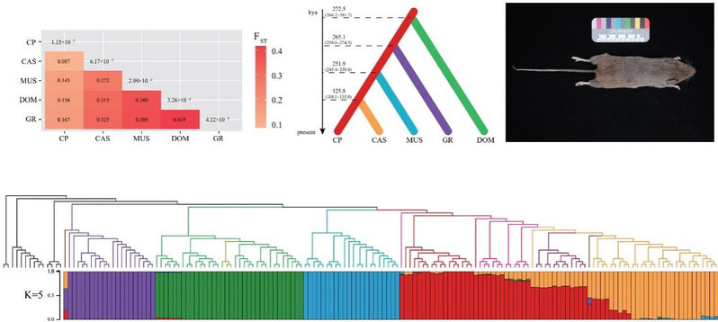 小家鼠是实验小鼠的祖先,包含世界范围内邻域分布的三个主要亚种(M. m. domesticus, M. m. musculus, M. m. castaneus)。之前研究显示,印度北部是小家鼠亚种分歧中心,但中心群体的具体分布区一直未确定。在青藏高原第二次科学考察期间,研究组从尼泊尔西南部和西藏自治区吉隆盆地采集到32只Mus鼠样本,对其进行了全基因组测序。结合该属不同物种的全基因组数据进行了系统基因组学研究。研究不仅确定了我国与巴基斯坦、我国与印度接壤地带为小家鼠中心群体分布区,还发现尼泊尔西南部样本属于中心群体与M. m. castaneus亚种过渡类群,而吉隆盆地的样本代表该物种的新亚种(命名为M. m. gyirongus)。分化时间推算提示,吉隆新亚种与M. m. domesticus 和M. m. musculus分化时间接近,约25~27万年前相继从中心群体分化,而M. m. castaneus约13万年前才分化出来,亚种分化时间对应于不同的间冰期阶段。吉隆亚种与中心群体分歧之后,基因组内与细胞周期调控与癌症发生、生殖与胚胎发育(尤其神经突触的结构与功能)以及外源刺激免疫反应密切相关的基因经历了正选择。吉隆新亚种的发现有助于更全面理解小家鼠种内分化历史,还为生物学和生物医学研究提供了新的地域特色遗传资源。